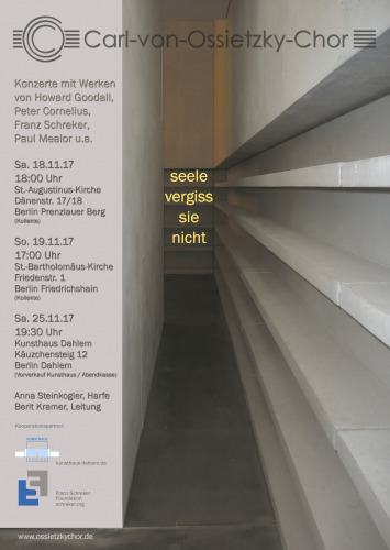Das Konzert will erinnern: An Exilkomponisten und -künstler, die teilweise weder im Exil noch nach ihrer Rückkehr nach Deutschland künstlerisch Fuß fassen konnten und in Vergessenheit geraten sind. Und es will zu einer aktiven Auseinandersetzung mit dem geschichtlichen Erbe sowie mit Leben und Tod anregen. Der Carl-von-Ossietzky-Chor möchte Sie einladen, in unserer schnelllebigen Zeit einen Moment inne zu halten – im Gedenken an die Menschen, die für uns persönlich und für unsere Gesellschaft wichtig sind.